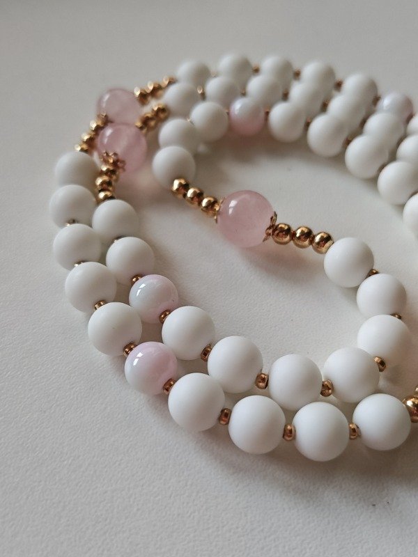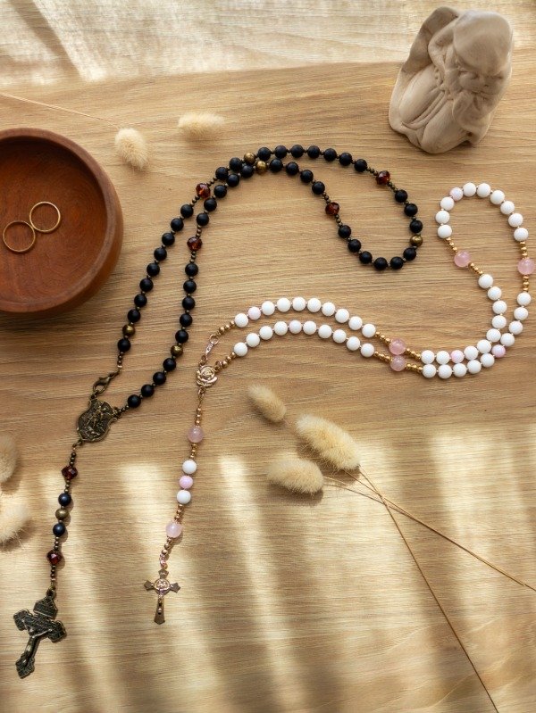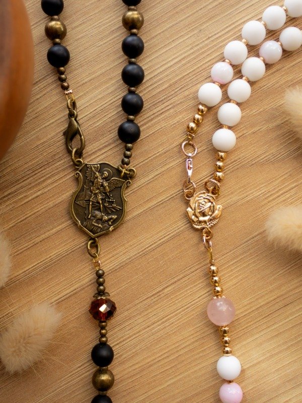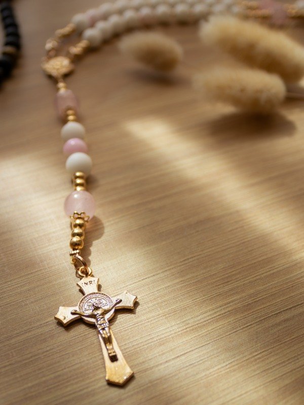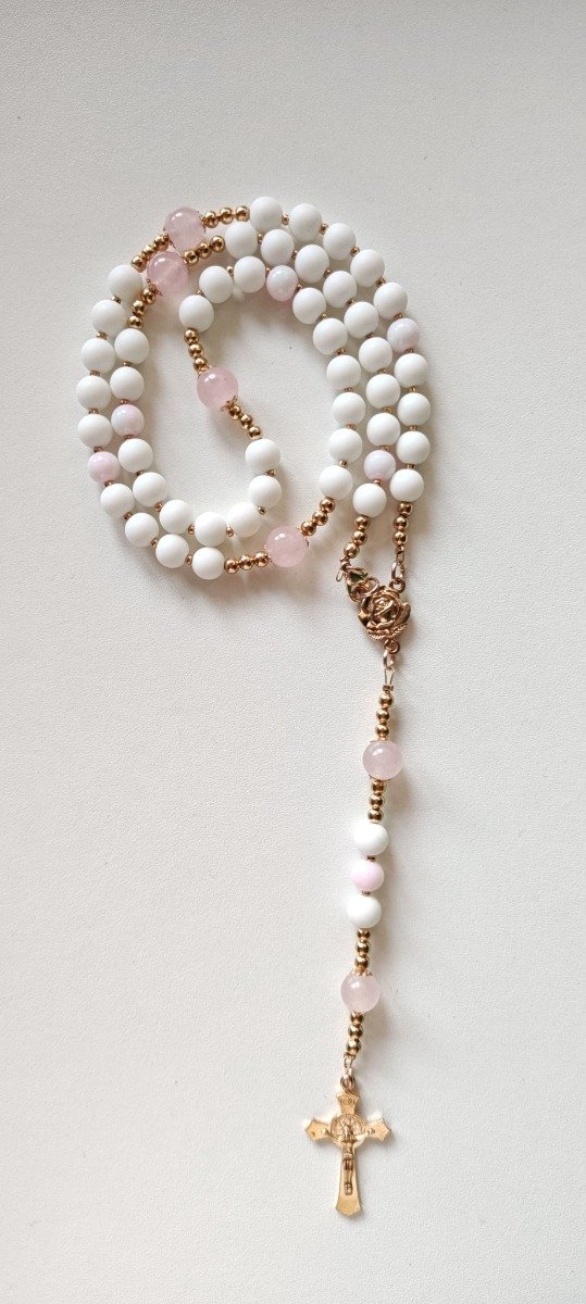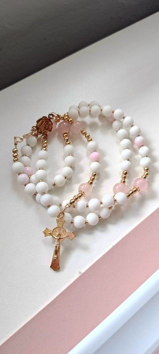 Hecho en cuentas de piedra y detalles en cuentas de vidrio. Con Ónix natural blanco y una cuenta de vidrio marmolado para los Ave María, cuentas naturales de cuarzo rosa para los Padre Nuestros y detalles en dorado, éste Rosario es único en todo sentido. Su centro con la imagen de una rosa combina perfectamente con su Crucifijo y le dan un brillo especial. Al estar confeccionado en tanza de acero dorada, es muy resistente a los tirones.