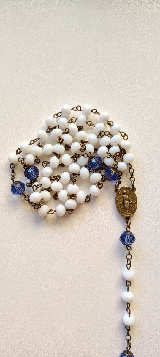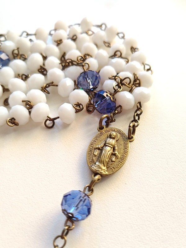Delicado Rosario de enganche elaborado en cristales de vidrio color blanco pleno de 8 mm para los Ave María, cristales celestes translúcidos de 10 mm para los Padre Nuestros y detalles metálicos en fundición de color bronce, incluyendo calotas que rodean a las cuentas celestes para resaltar su color.